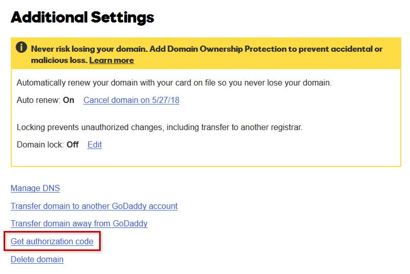 Once you have disabled the domain transfer lock and private registration for your domain, you can access your authorization code from GoDaddy.