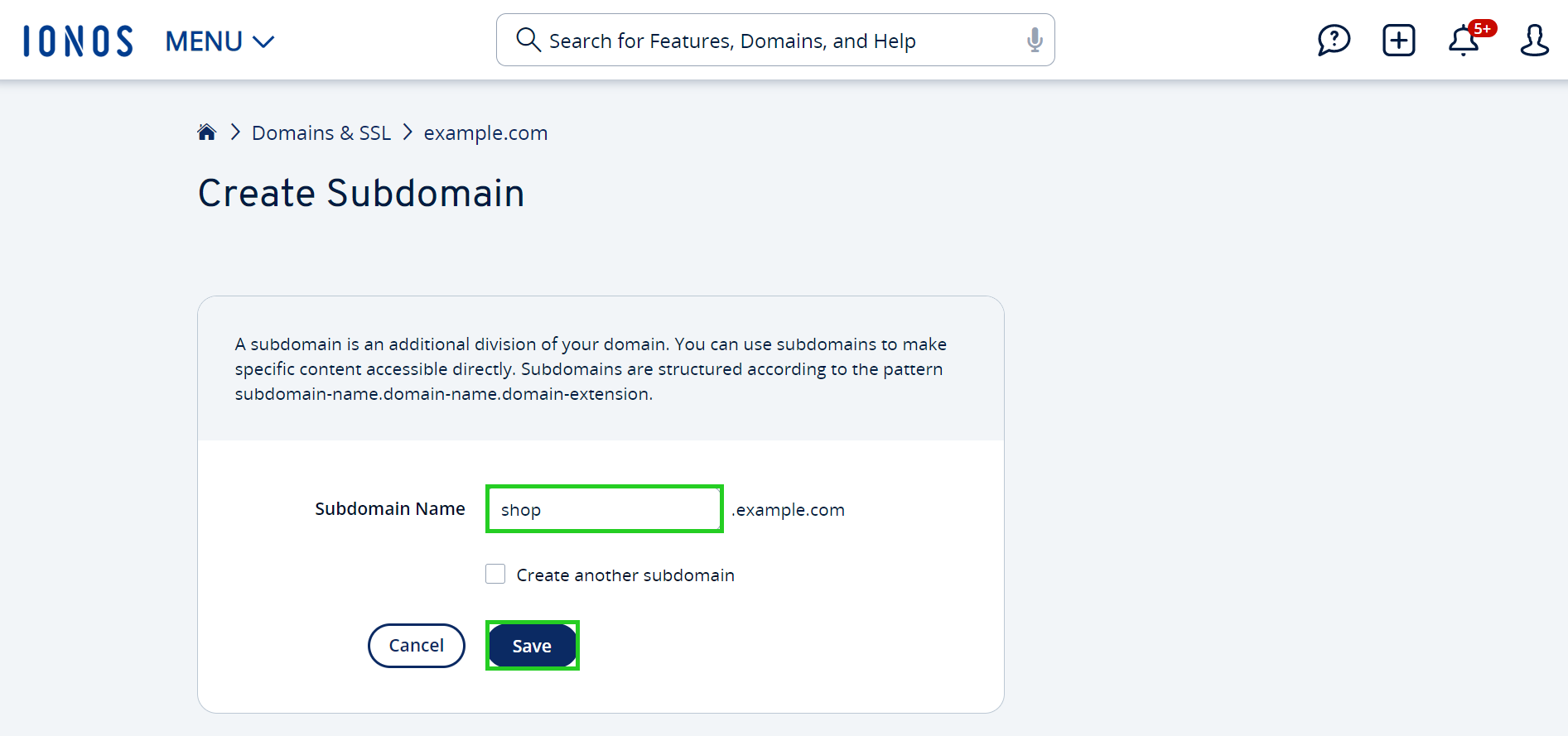 Use the subdomain name that you recorded from your old provider. For example: shop.your-domain.com. - Click Save.