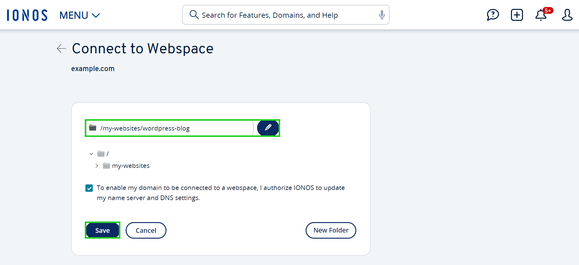 Tip: Click the pen icon to enter the path to your website directly. For example: /my-websites/wordpress-blog. - Click Save.