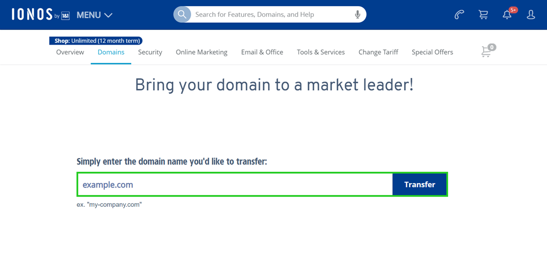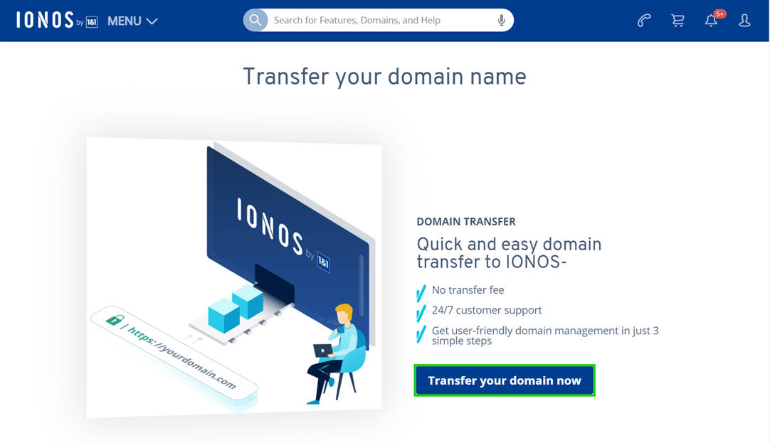 You have a domain set up as an external domain in your IONOS account but want to switch to IONOS completely with this domain? Then you can transfer the domain to your IONOS contract by performing a domain transfer.
