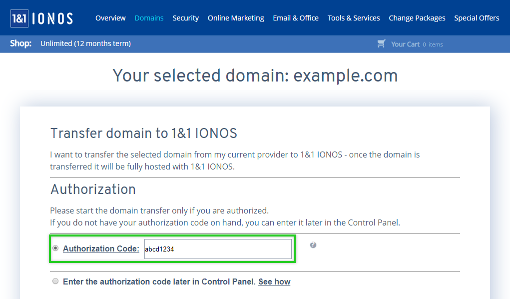 - In the second part, you start the domain transfer at IONOS and confirm it with the authorization code.