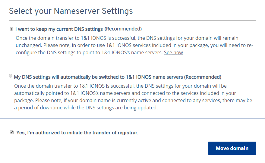 - Go to the Select Your Nameserver Settings section and select whether you want to keep the current DNS settings or switch them to the IONOS default DNS settings.