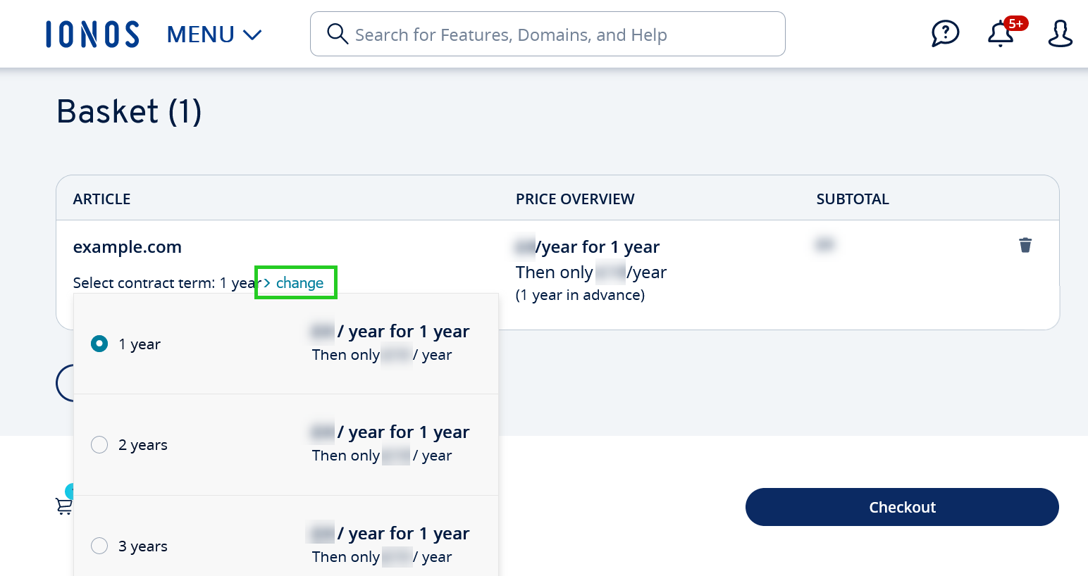 - You will be forwarded to the IONOS customer shop. At Select contract term click change to display the options available for your domain.