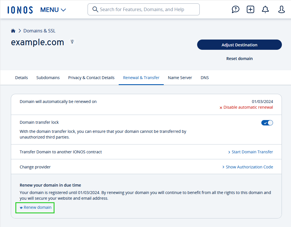 When you register a domain with IONOS, automatic renewal of the domain is enabled by default. For additional domains, you also have the option of renewing them in advance for several years.