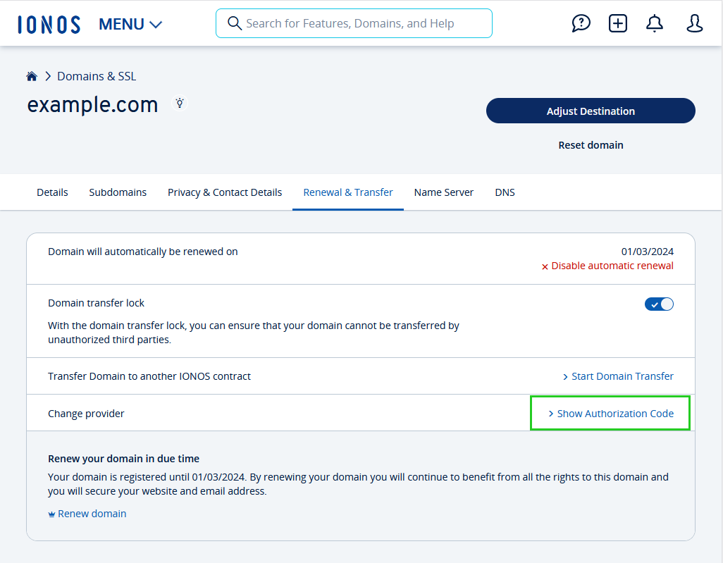 This article shows you how to view the authorization code for your domain in your IONOS account.