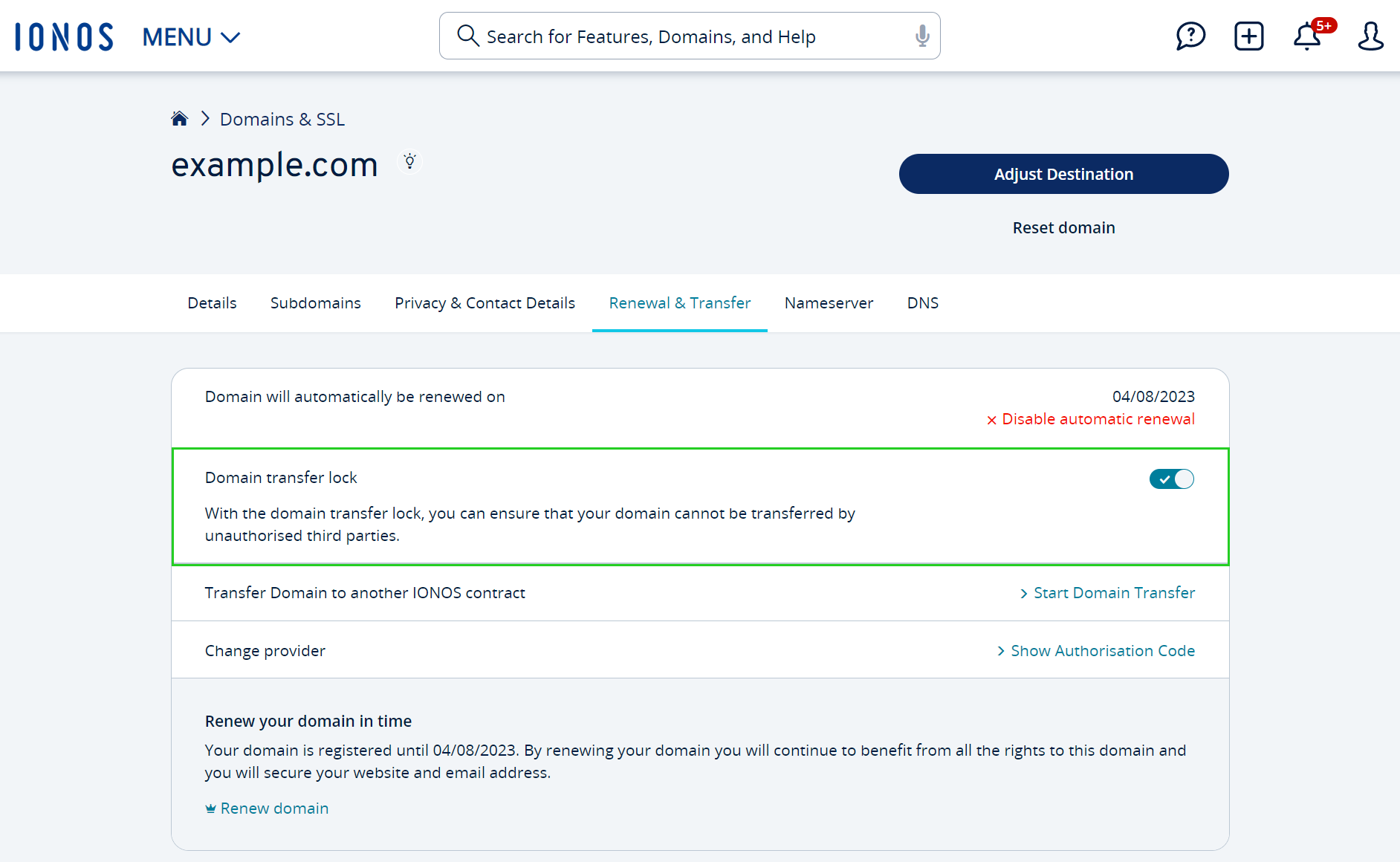 Activating a Domain Transfer Lock with IONOS