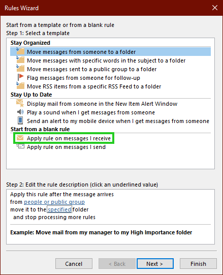 Select Apply rule on messages I receive.