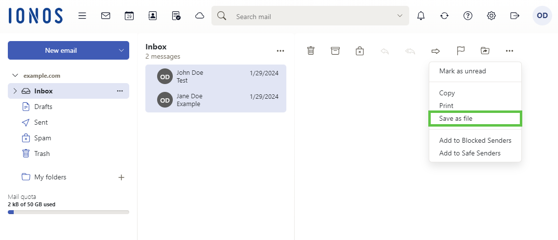Optional: To save an entire folder, such as the entire Inbox, click on the desired folder. Then, select any email displayed and press Ctrl+A to select all of the other emails in the folder.