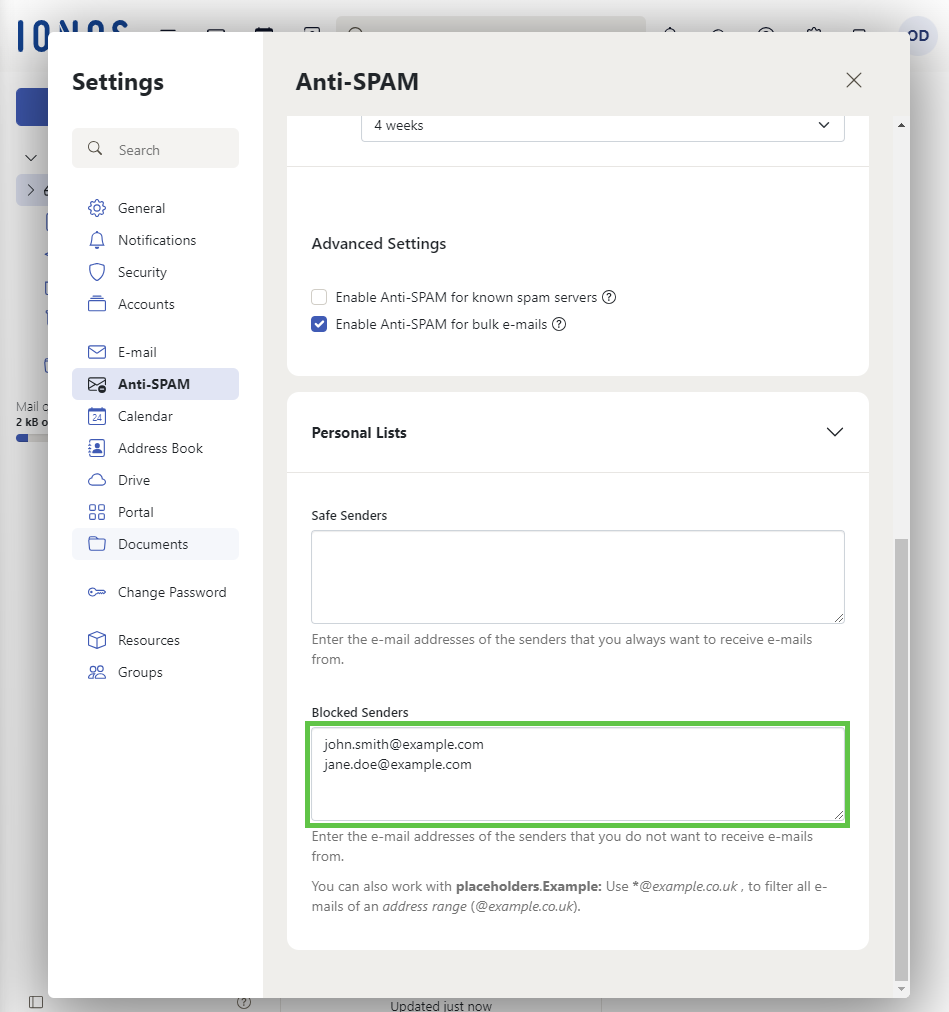 If you repeatedly receive unwanted or advertising spam emails from a certain sender, you can set up a list of Blocked Senders in IONOS Webmail (formerly called a blacklist). Such a list ensures that these emails are filtered directly into the spam folder and no longer appear in your inbox.