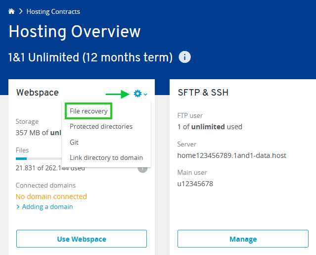 - In the Webspace section, click the gear icon and select the File Recovery option.