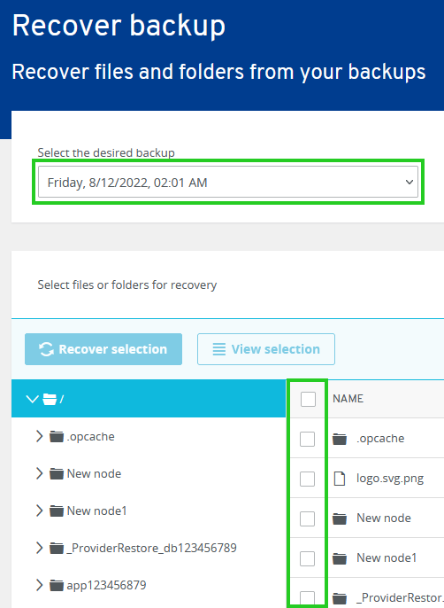 - Select the desired backup from the drop-down list. The Explorer section of the page will now show you the folders and files included in the backup.