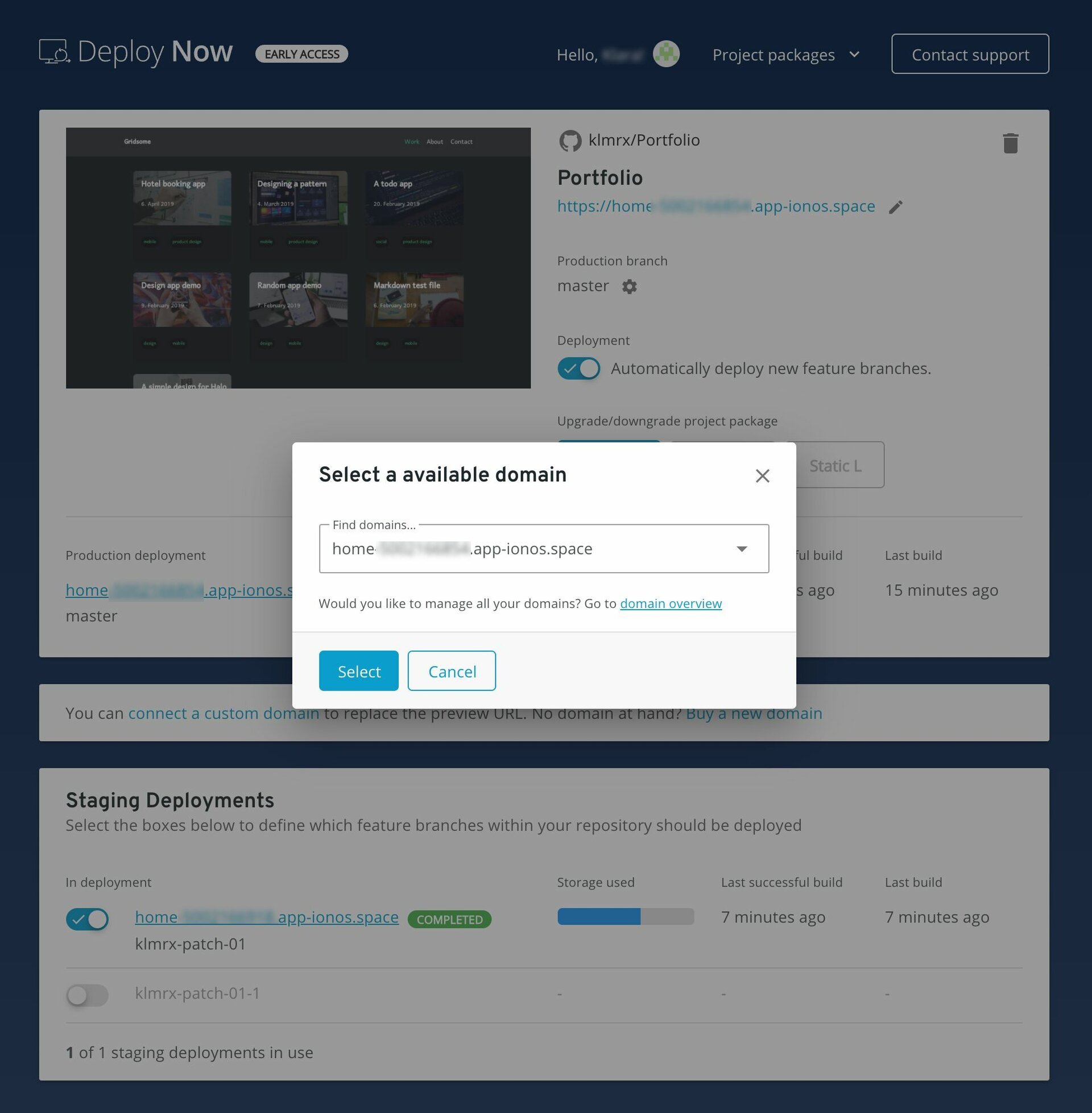 Click Connect your domain to connect a domain in your IONOS account to your Production deployment. You can also purchase a new domain at any time from IONOS and link it to your project.