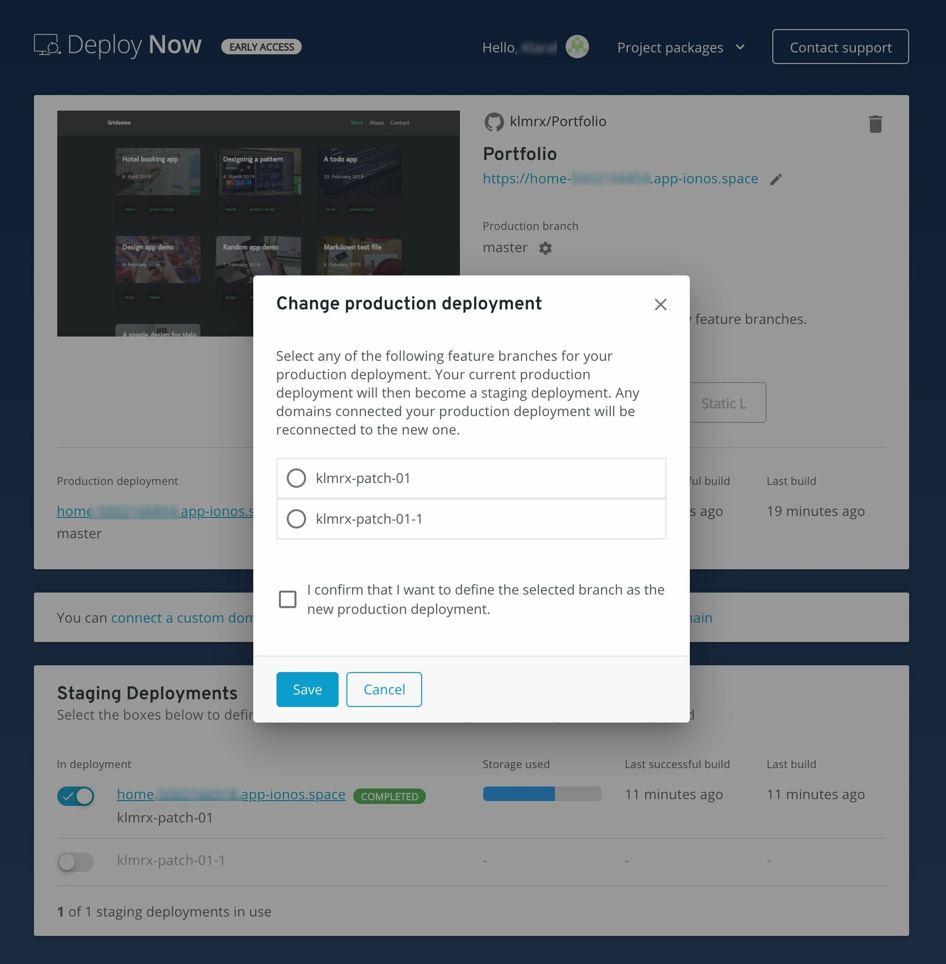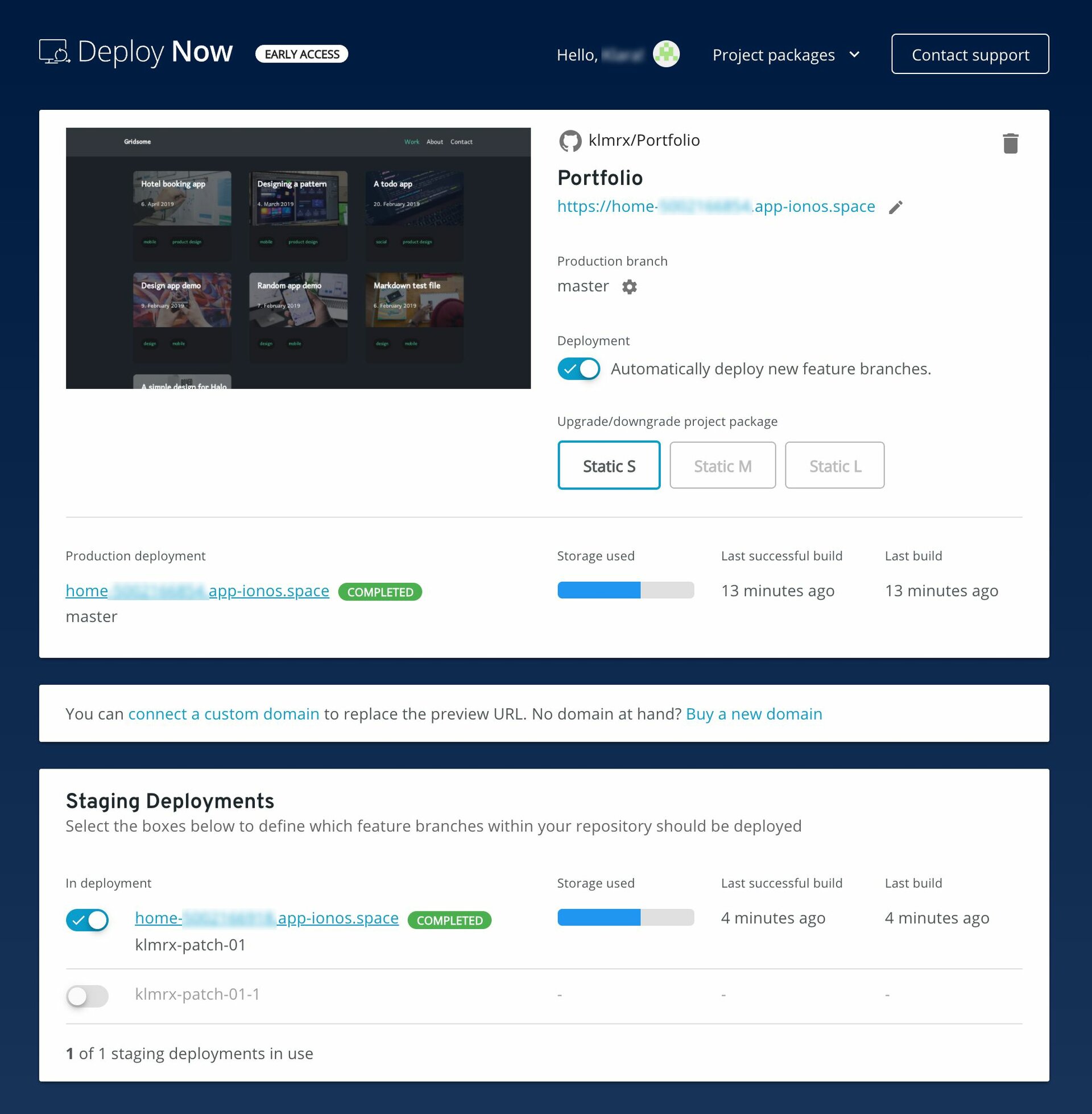 Additionally, you have the option to create feature branches of your GitHub repository as staging deployments. We automatically equip these with a preview URL. Simply select one of the feature branches listed under "Staging Deployments" and save your change.