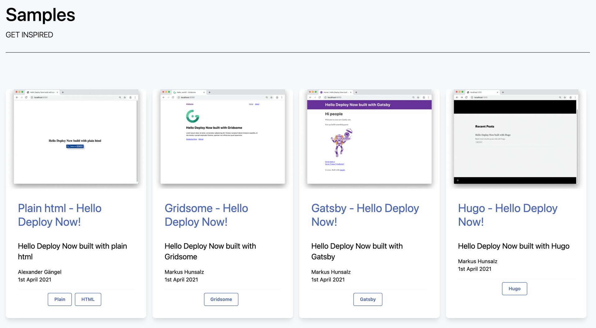 Alternatively, you can use one of our sample projects by clicking Deploy one of our examples. Our examples include a selection of sample projects for the most popular scripting languages and templates.