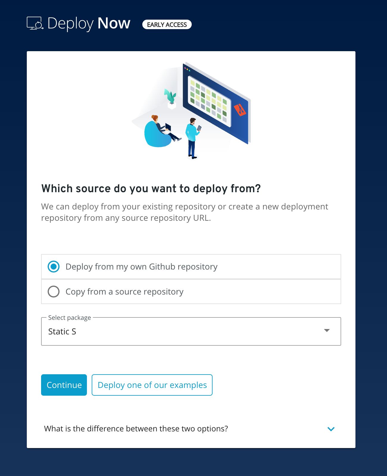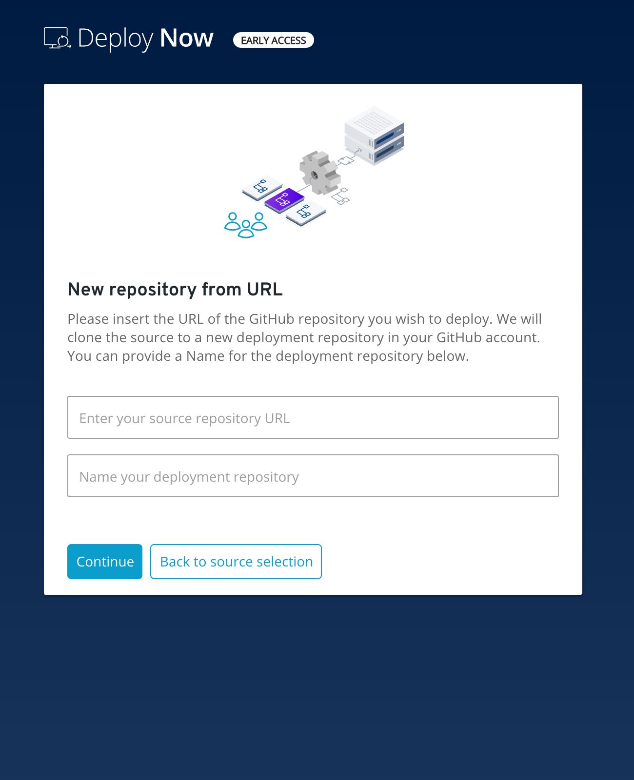 To deploy a repository from any other GitHub account, select the Copy from a Source Repository option. Then, enter the GitHub URL of the source repository and choose a name for the repository. As part of the setup process, we'll create a copy of the repository under your chosen name in your GitHub account.