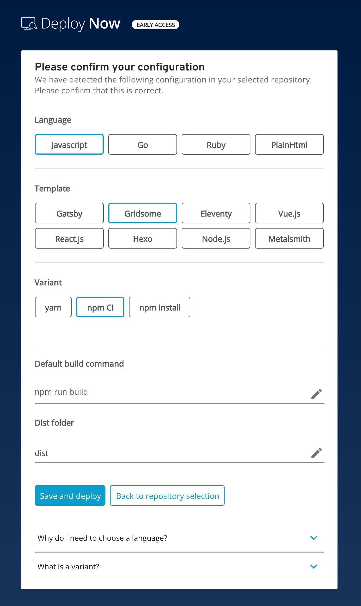 After selecting your repository, you still need to confirm the script language used, the template and the build variant. Additionally, you have the option to customize the build command and the dist folder.