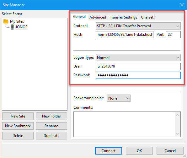 Your SFTP connection is now stored in FileZilla. You can now establish the SFTP connection and Transfer Files with FileZilla via SFTP.