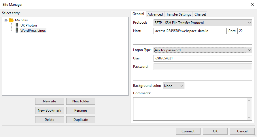- If you want to add the entry in the FileZilla server manager yourself, you will need the details of your SFTP access from your IONOS account.