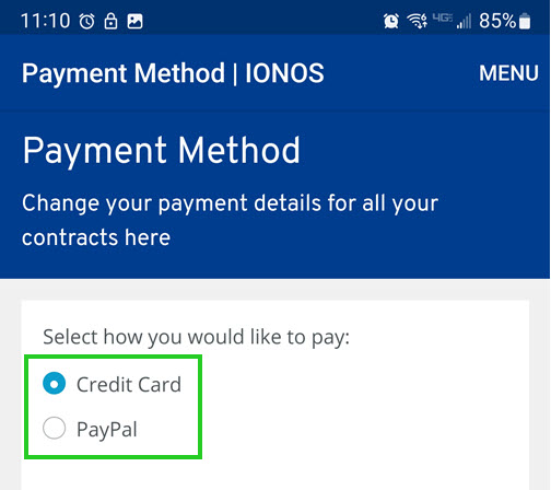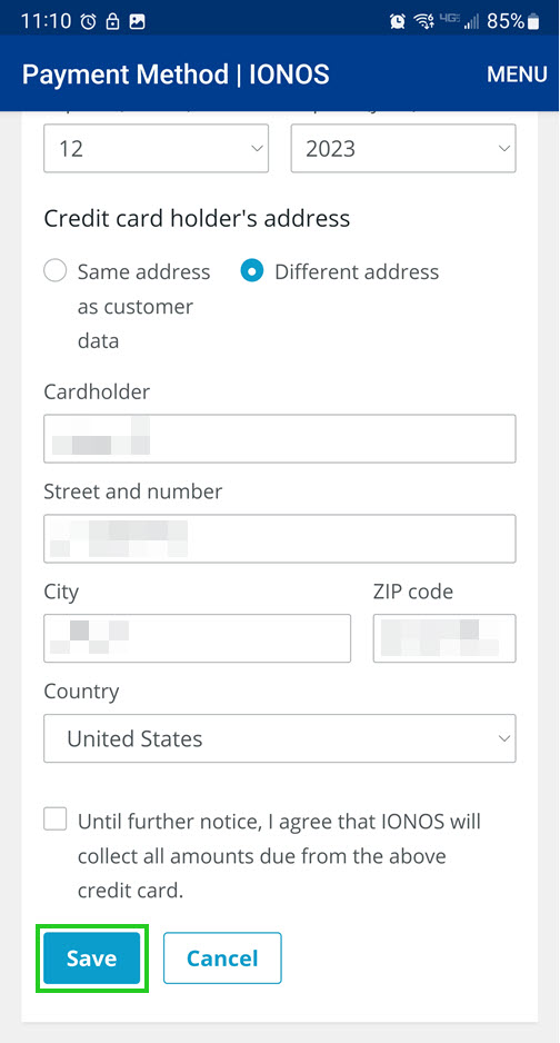 Check the box allowing IONOS to use the new payment method for your IONOS invoices.