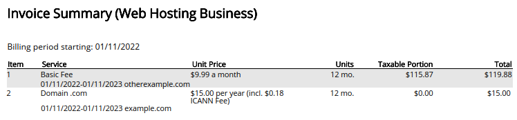 - Service: This column shows the name of the product/feature being billed and the billing period covered by this invoice.