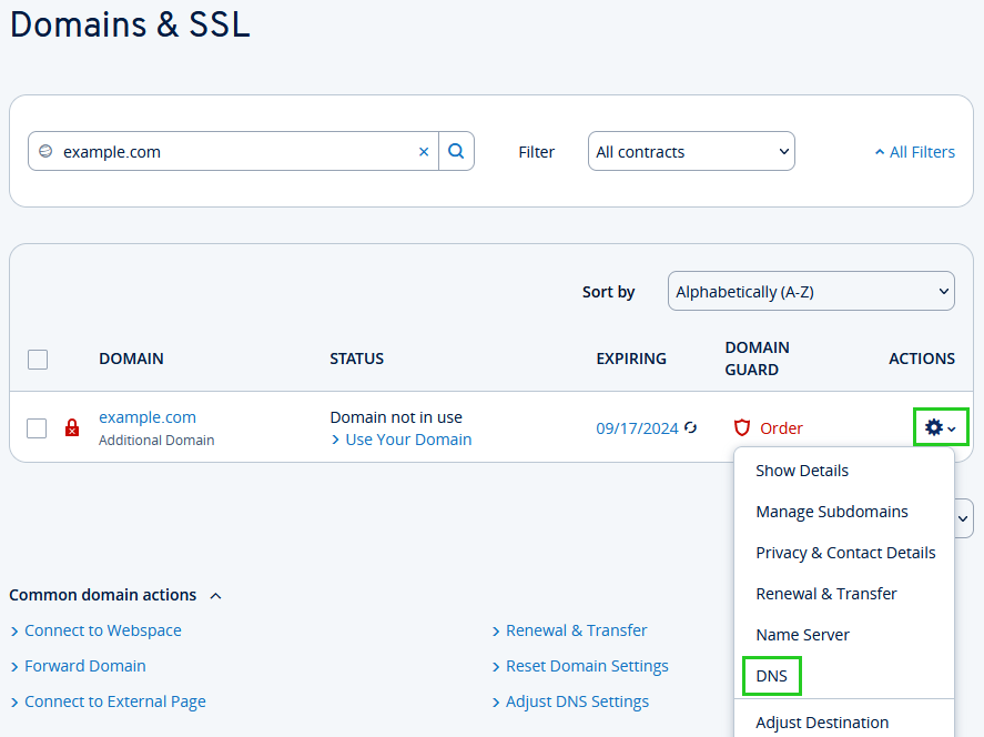 Click on the gear icon under Actions for the desired domain.