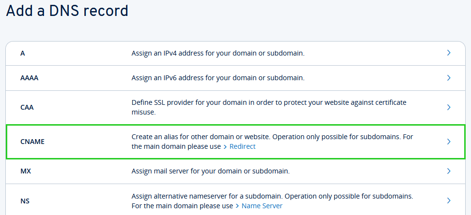 Under Type, select the entry CNAME.