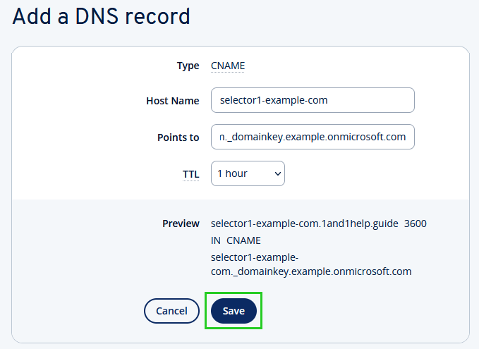 Enter the fully qualified host name here. This is entered without the http:// or https:// part - e.g. selector1-example-com01b._domainkey.maxmustermann.onmicrosoft.com.Make sure that the TTL is set to 1 hour.