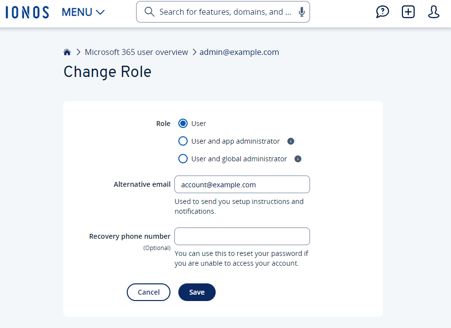 In Microsoft 365, different roles determine the level of access and responsibilities for managing users, applications, and settings. This article describes three key roles that are available in the IONOS account for selected user accounts: