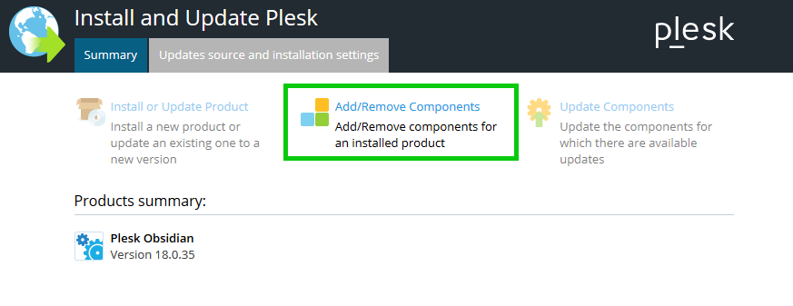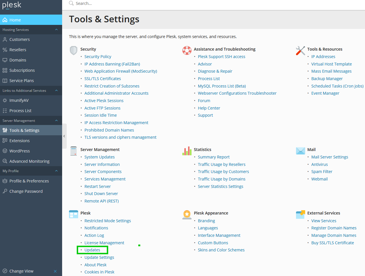 The Start window opens.In the navigation bar on the left, click Tools & Settings and then, in the Plesk section, click Updates.