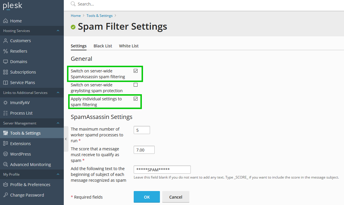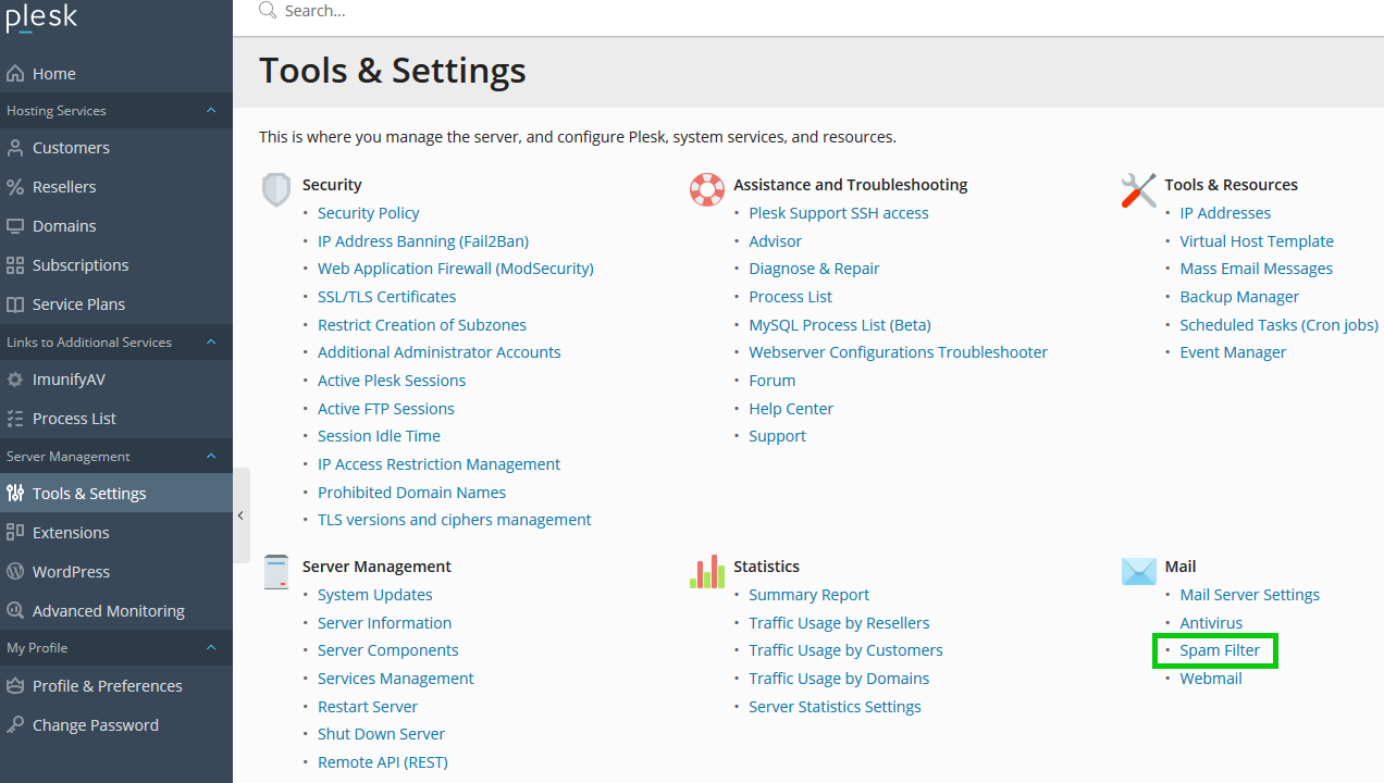 Enabling a Spam Filter in Plesk