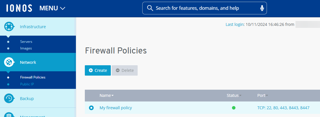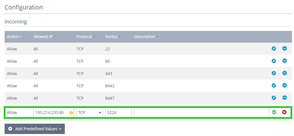 - You can customise the incoming firewall rules in the Configuration area. To enable the following combination of IP address and port for outgoing connections, enter the IP address in the Allowed IP input field and the port in the Port(s) input field: