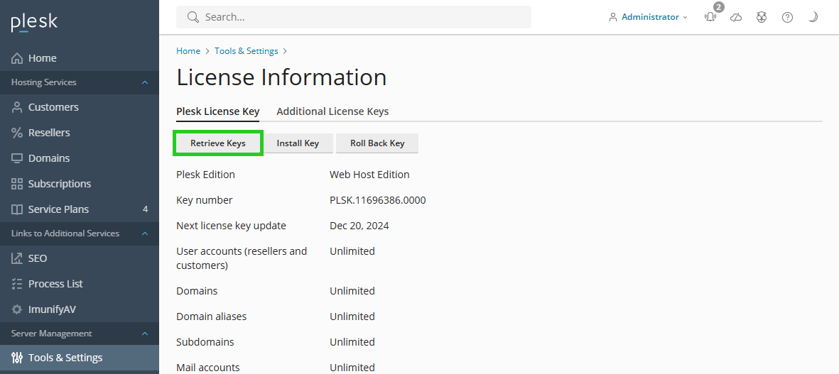 - In the Plesk Licence Key tab, click Retrieve Keys. Once retrieved, the licence key is automatically activated in Plesk.