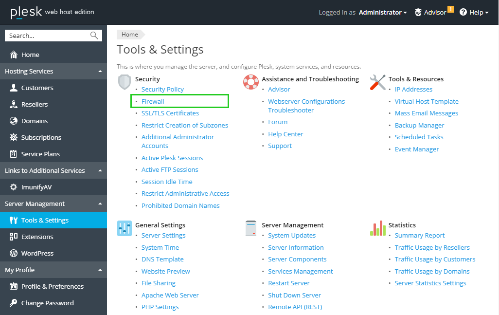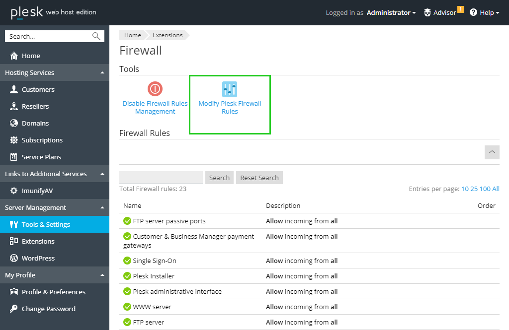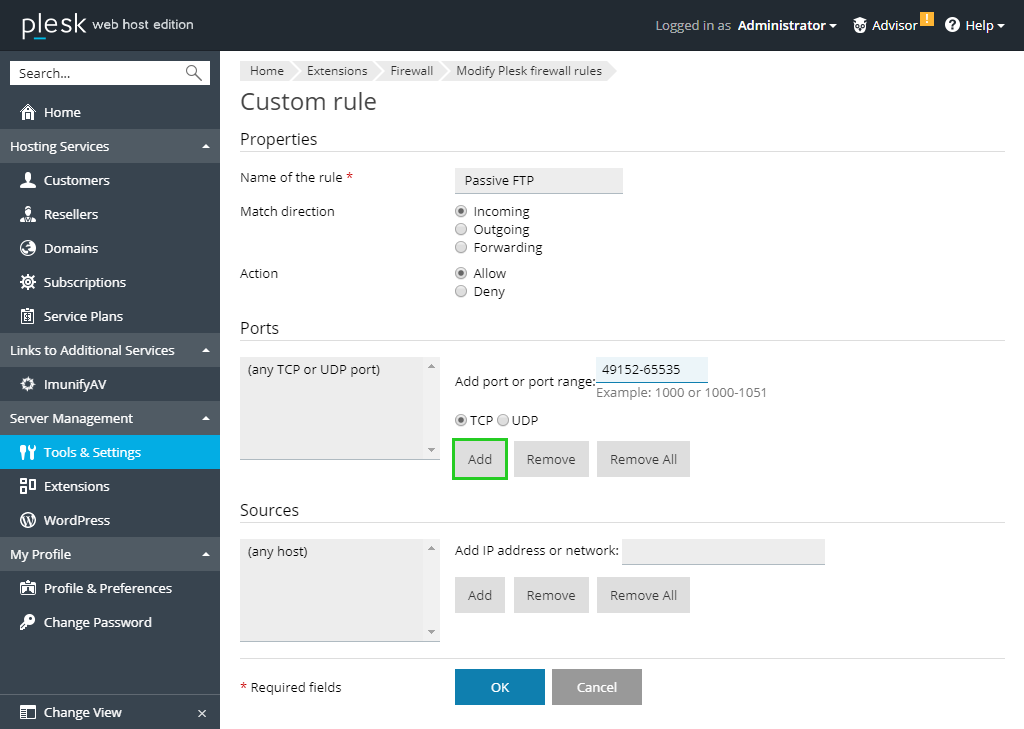 If you have installed the Plesk firewall and enabled a default configuration, you will need to add a firewall rule as a next step telling the firewall to allow passive FTP mode. Proceed as follows: