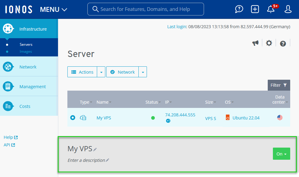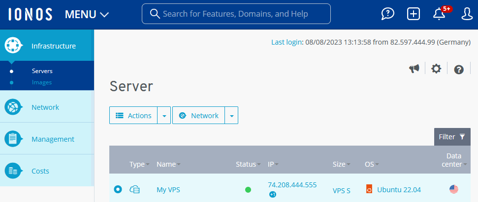 In the Infrastructure > Servers section of the Cloud Panel, the VPS Linux, VPS Windows, or migrated Cloud Servers you have configured is listed in a table. This table lists the most important information about your server.