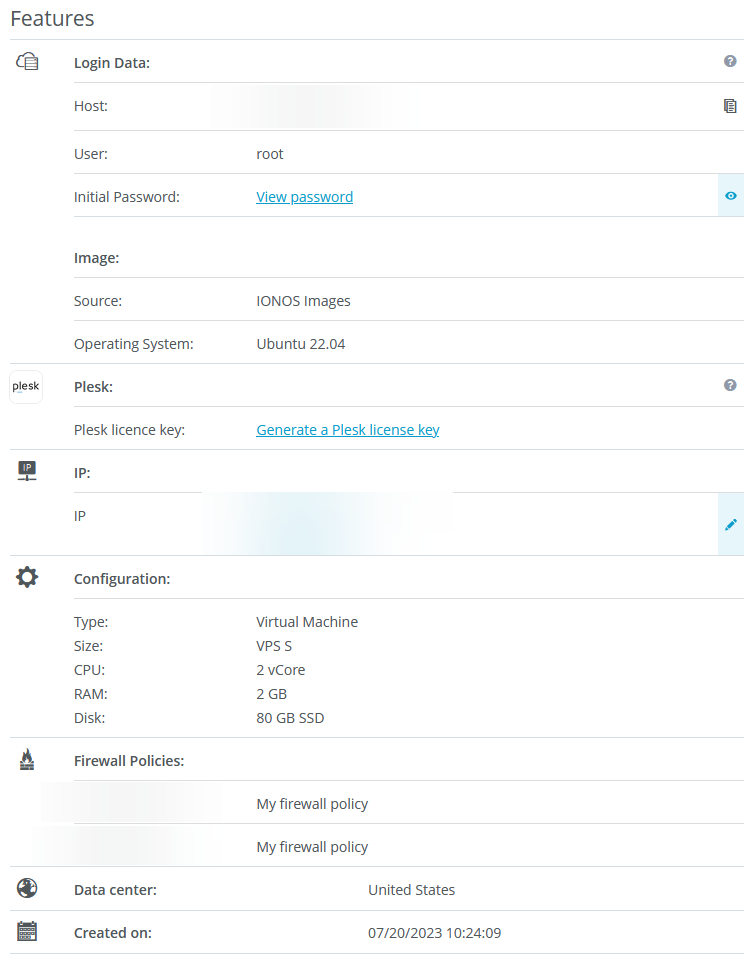 Firewall Policies: IP address of the server and the assigned firewall policy.