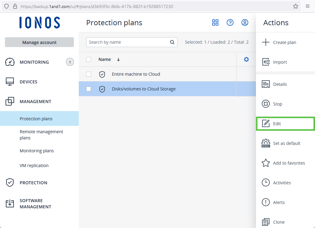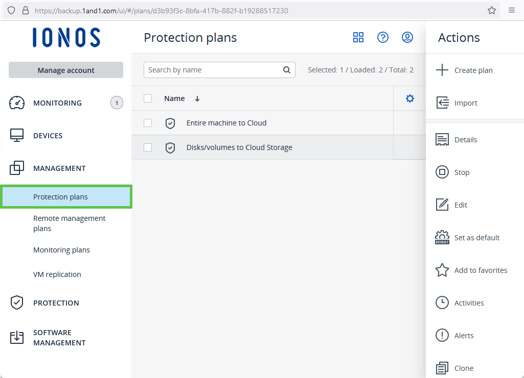 You can configure your backups individually in the backup console. It is possible to configure several protection plans for a computer with the Microsoft Windows, Linux and macOS operating systems or for a virtual machine with Microsoft Windows or Linux. In this way, you can also map complex backup routines. To be able to manage the backups, you must install the backup agent on the desired computer or virtual machine. It is then necessary to register the computer or virtual machine in the backup console. When you register a computer or virtual machine in the backup console, a protection plan is automatically set up to create a complete backup.