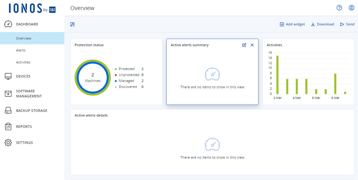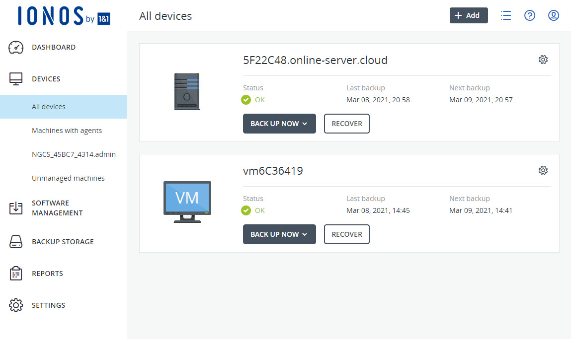 For each backup destination, there is a separate backup console where you can manage the devices you want to back up, your backup plans, and the backups you have already created. You can open these backup consoles from the Cloud Panel interface. For more information, click here: