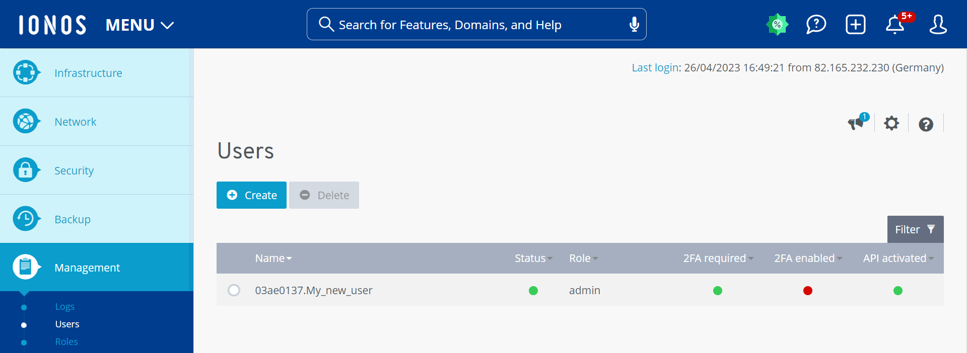 All user accounts that you create in the Cloud Panel are listed in a table in the Management > Users section. The table lists the most important information about each user: