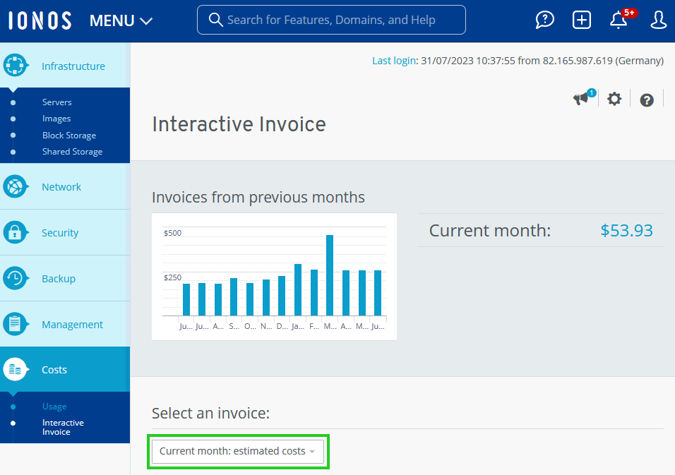 In the Interactive Invoice section, the costs of the previous months are displayed graphically. In addition, in this section you can view the invoices of the previous months and the expected costs of the current month.