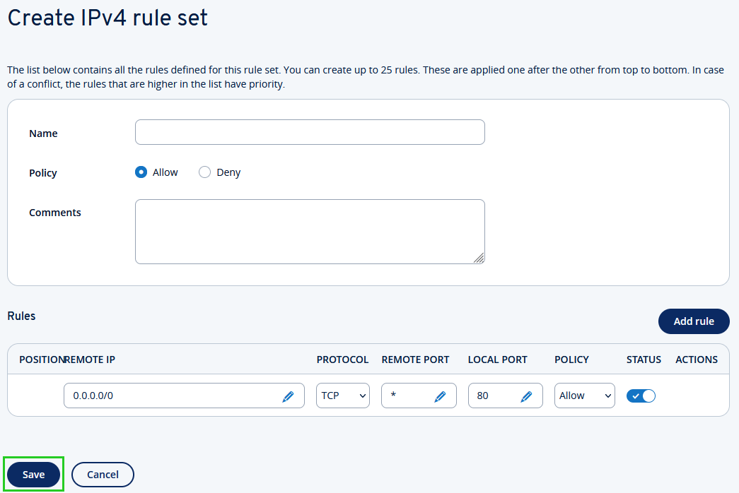 A rule set can contain up to 25 rules. The firewall rules are evaluated from top to bottom. Exception rules that affect individual IP addresses should therefore be at the top.