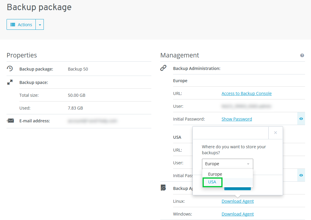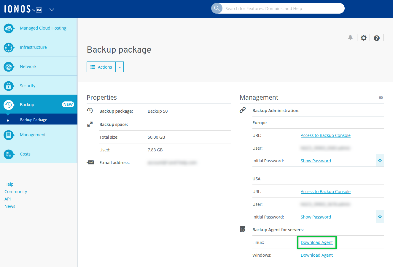 Select the desired Cloud Server contract that was set up for you after ordering the Cloud Backup plan. The Cloud Panel will open and the Backup > Backup Package section will be displayed.