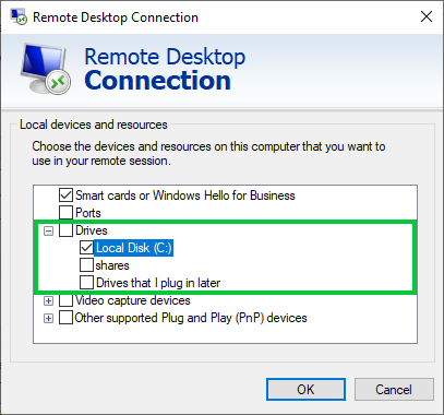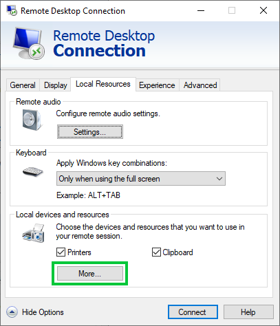 Select the Local Resources (Windows 7 and 8) or Local Devices and Resources (Windows 10) tab and click More...