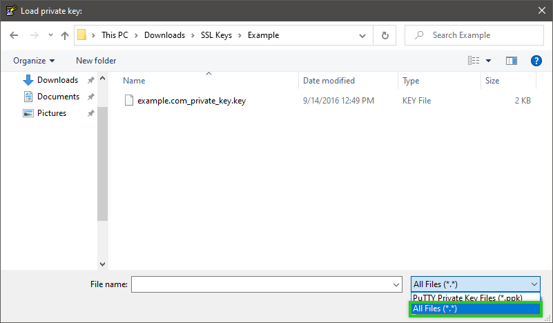 In the Load private key: window, select All Files (*.*) in the lower right corner.
