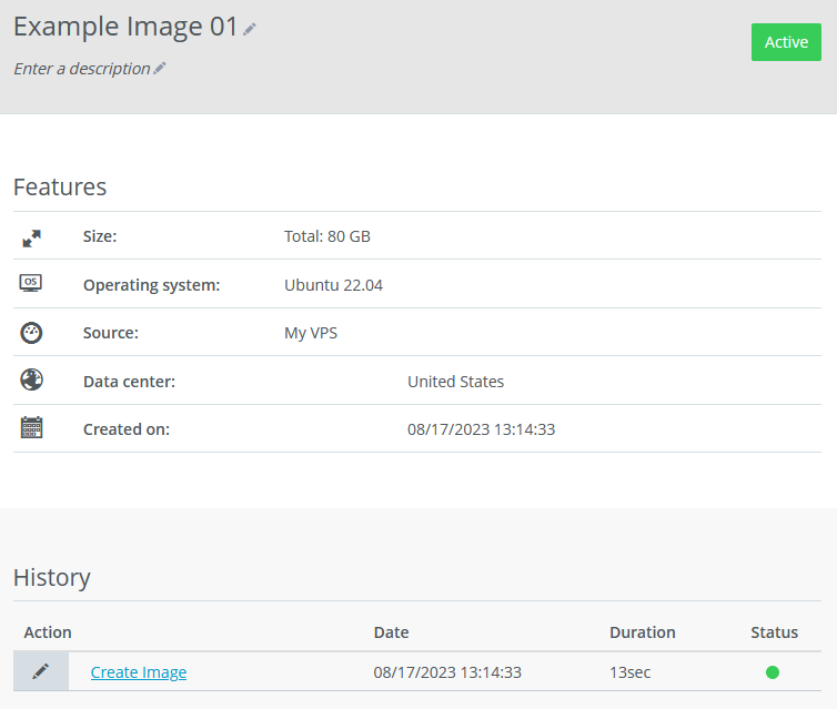 Below the table the name of the image is listed again. Below that, the description of the image appears. You can change both the name and the description of the image at any time.