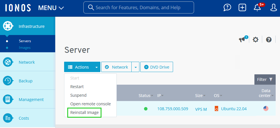 You can restore your VPS by installing an image. You can use your own images or images provided by IONOS for this purpose. This article tells you how to reinstall an image on an existing VPS: