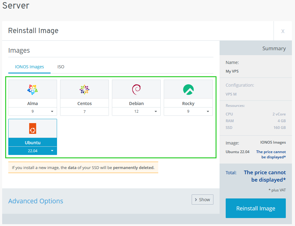 Select the desired image. The IONOS Images tab displays images of various operating systems that are provided to you by IONOS. The My Images tab displays images that you have created yourself from your VPS.