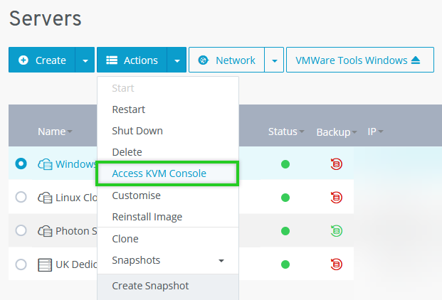 The KVM console opens in a new tab.Click Send Ctrl+Alt+Del.