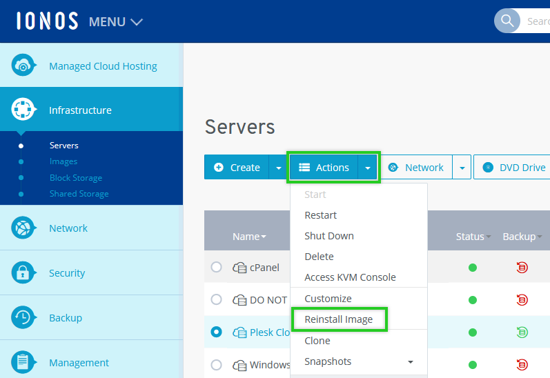 When you reinstall an image on a server, all existing data on the server is irretrievably deleted and replaced with the data from the newly installed image. This process cannot be undone. Make sure that a backup of the server is created before installing the image to prevent the risk of data loss.