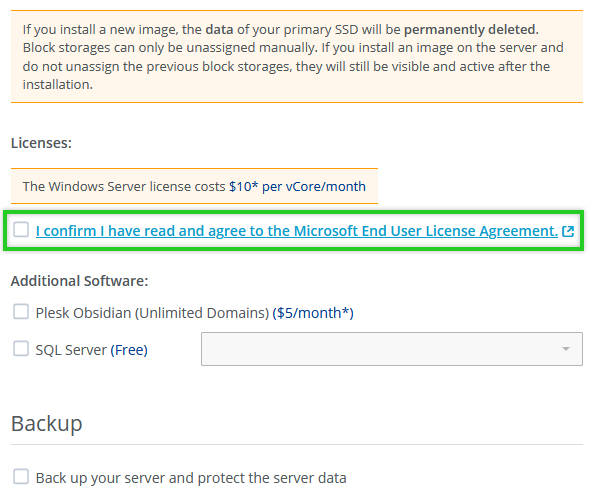 If you install an image with the Microsoft Windows Server operating system, you must read and accept the Microsoft End User License Terms.