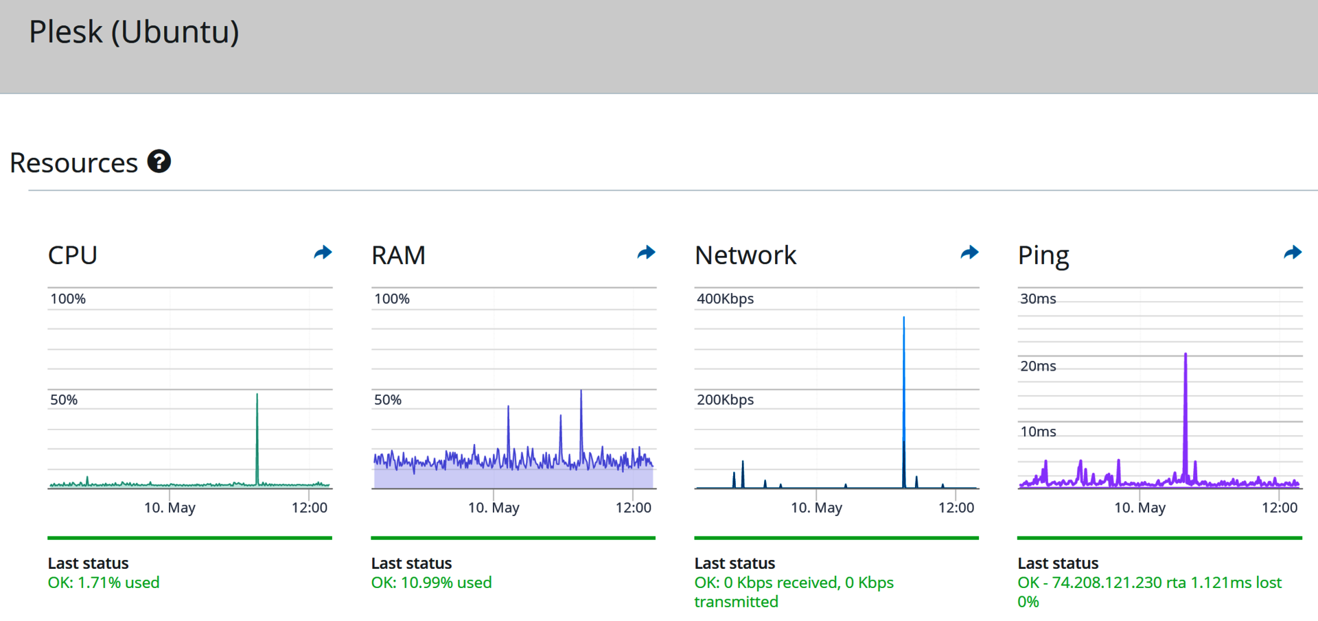 To view a graphical analysis of the monitoring of the last 24 hours as well as an overview of the status of the monitored ports and processes, click the appropriate server name.